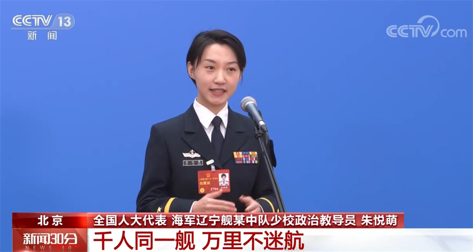 全國人大代表 海軍遼寧艦?zāi)持嘘?duì)少校政治教導(dǎo)員 朱悅萌:這10年里,我們遼寧艦從下水啟航、戰(zhàn)機(jī)上艦到遠(yuǎn)海部署,正在繪就大國重器更加深遠(yuǎn)、更加壯闊的奔涌航跡,我們把青春夢想融入祖國的航母事業(yè),千人同一艦,萬里不迷航,艦艏行處是長城,國家利益所至,海軍航跡必達(dá)。