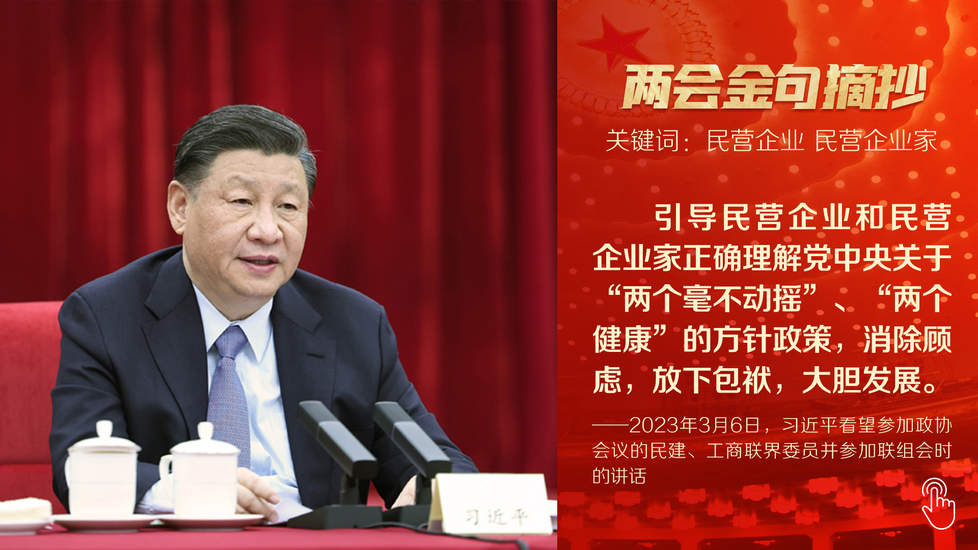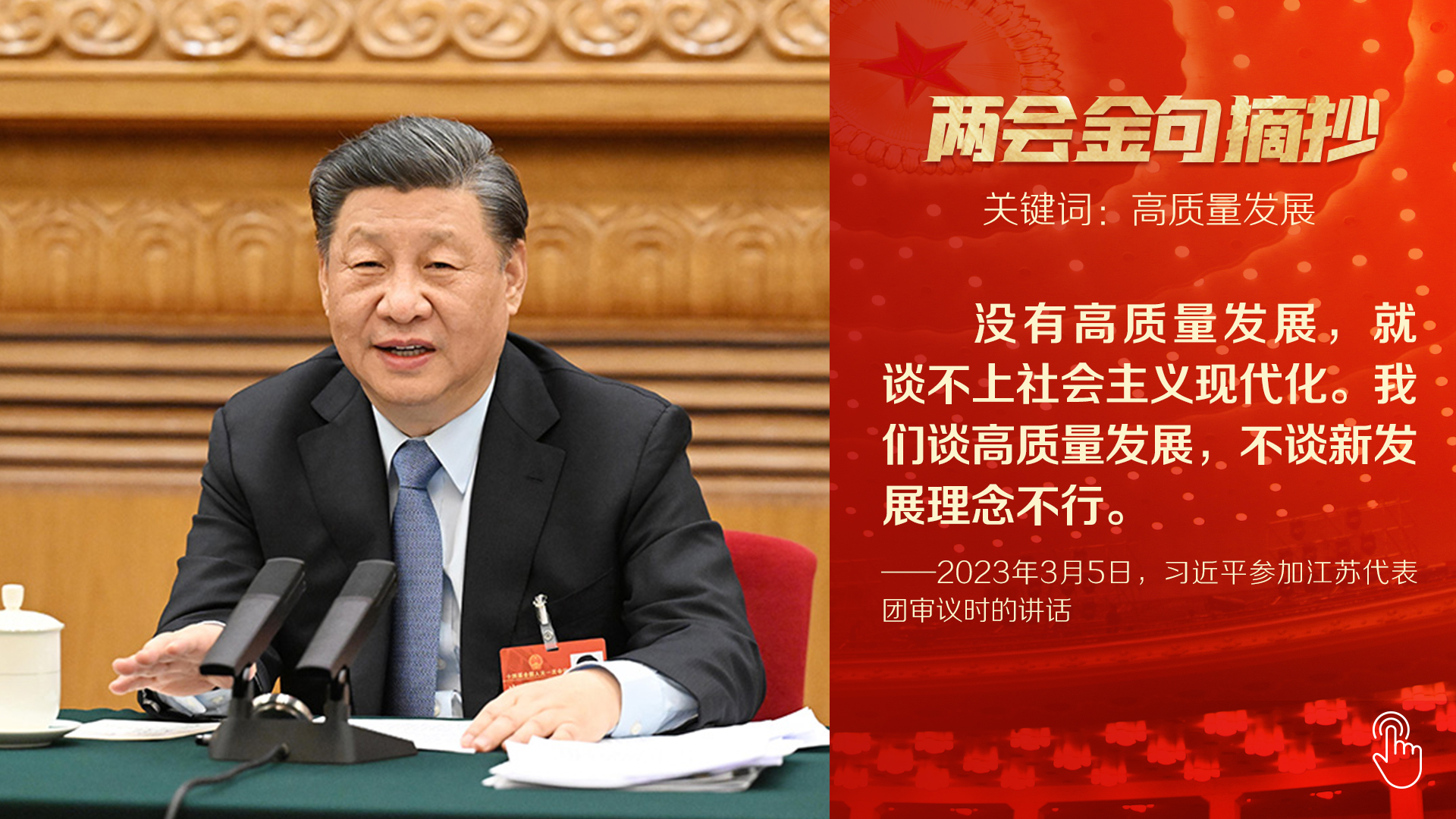 “高質(zhì)量發(fā)展是全面建設(shè)社會主義現(xiàn)代化國家的首要任務(wù)。”今年兩會首次到團組,總書記以高質(zhì)量發(fā)展為題,詳細闡述中國未來施政發(fā)力點。第二天參加民建、工商聯(lián)界委員聯(lián)組會,他又就正確引導民營經(jīng)濟健康發(fā)展、高質(zhì)量發(fā)展作出重要論述,一句“要堅守主業(yè)、做強實業(yè),自覺走高質(zhì)量發(fā)展路子”為全國4700多萬家民營企業(yè)指明方向。十四屆全國人大一次會議閉幕會上,總書記再次向世界宣示:在強國建設(shè)、民族復興的新征程,我們要堅定不移推動高質(zhì)量發(fā)展。