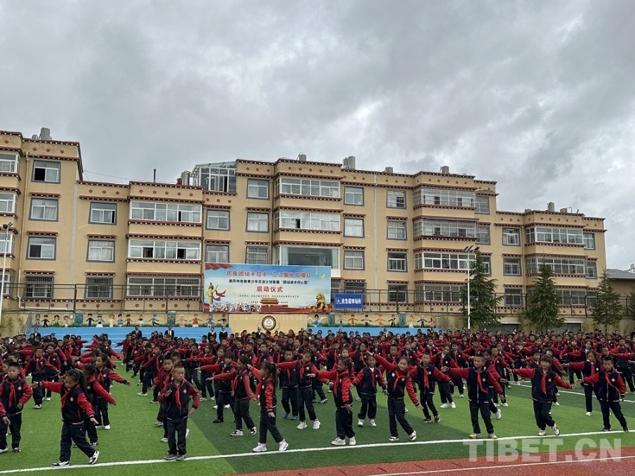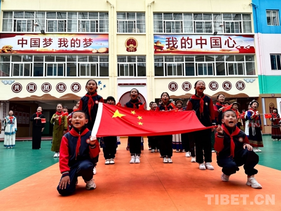 正在大課間休息的同學們,在老師的帶領下紛紛涌向操場,伴隨著歡快的舞曲跳起了藏族鍋莊;合唱團的孩子們唱起了該校自主編創(chuàng)的社會主義核心價值觀24字童謠,孩子們挺拔的身姿和鏗鏘的歌聲,盡顯文化自信和民族自豪感。