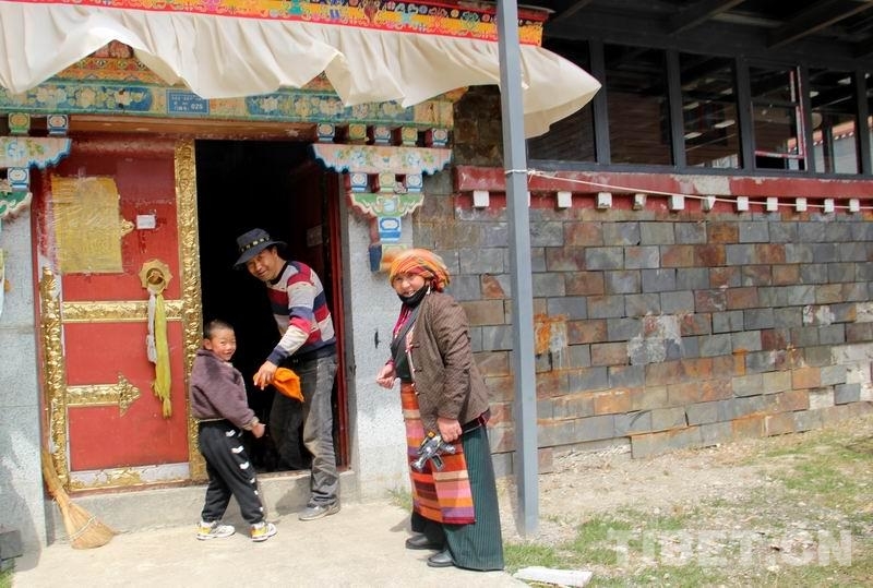圖為次卓瑪與女婿拉巴多吉正在家門口招呼剛剛放學的小外孫回家吃飯 攝影:劉莉