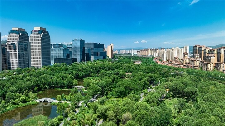 一座座公園游園如同綠色寶石般鑲嵌在城市中。