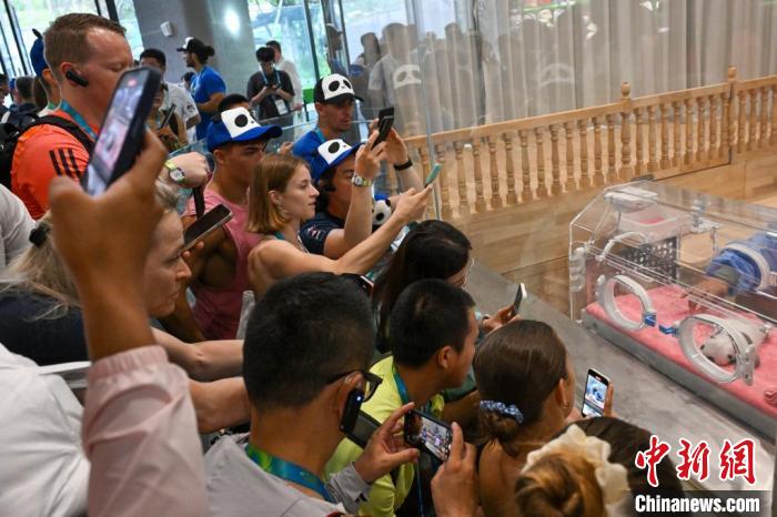 8月1日,成都大運(yùn)會的大學(xué)生運(yùn)動員們參觀成都大熊貓繁育研究基地,圖為運(yùn)動員圍觀大熊貓幼仔。 中新社記者 趙文宇 攝