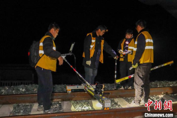 圖為2月9日晚,工作人員在西藏拉林鐵路線上進(jìn)行設(shè)備檢查作業(yè)。 馬生明 攝