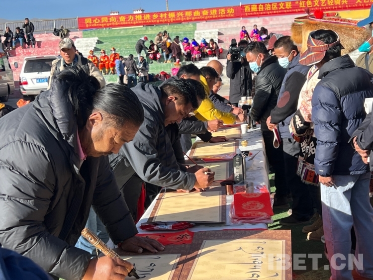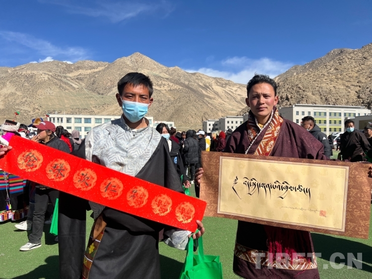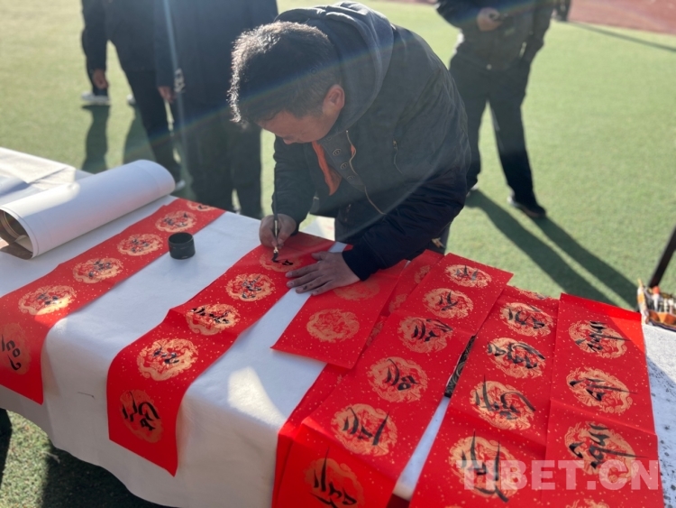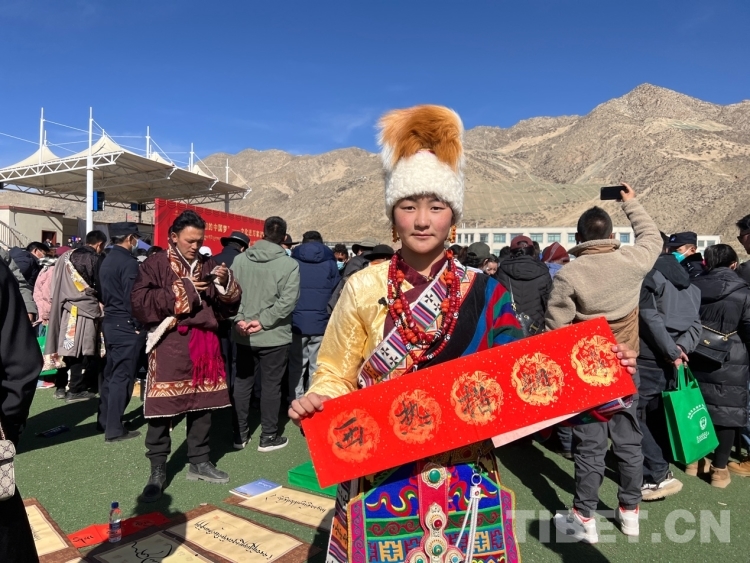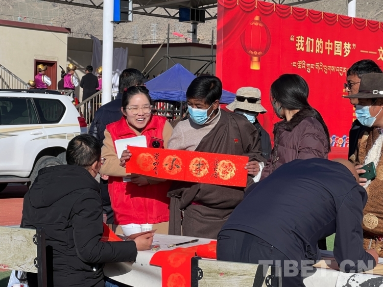 中國西藏網(wǎng)訊 2月16日,西藏自治區(qū)文聯(lián)主辦的“我們的中國夢”——文化進(jìn)萬家活動(dòng)在極高海拔生態(tài)搬遷安置點(diǎn)開展。在送“書法”現(xiàn)場,由西藏書法協(xié)會和山南市11位書法家為當(dāng)?shù)厝罕娝腿?00多張?jiān)⒁饷篮玫男履曜8:腿罕娖谕男履曜T傅取;顒?dòng)現(xiàn)場群眾絡(luò)繹不絕,大家心滿意足地拿著書法家為自己贈送的精美“禮品”。一旁書法家們忙碌地為群眾書寫祝詞,另一旁群眾們晾曬著他們得到的書法作品,一時(shí)間現(xiàn)場成了“書法展”,時(shí)不時(shí)地有人前來參觀欣賞。(中國西藏網(wǎng) 記者/德吉卓瑪)