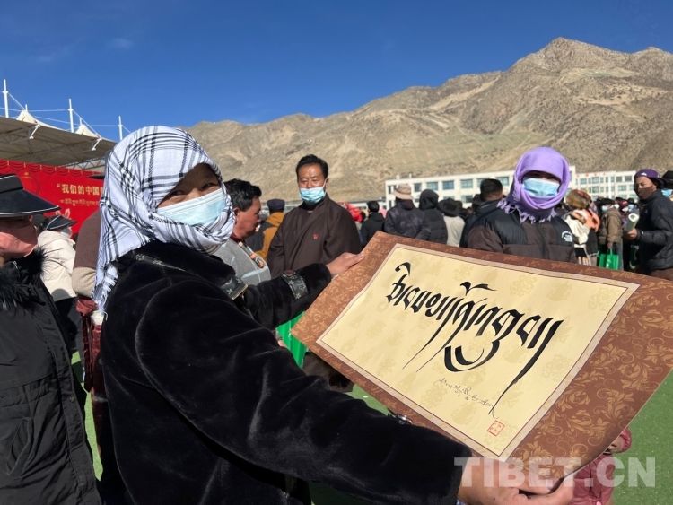 圖為群眾拿到寫有“幸福家庭”字樣的書法作品 攝影:德吉卓瑪