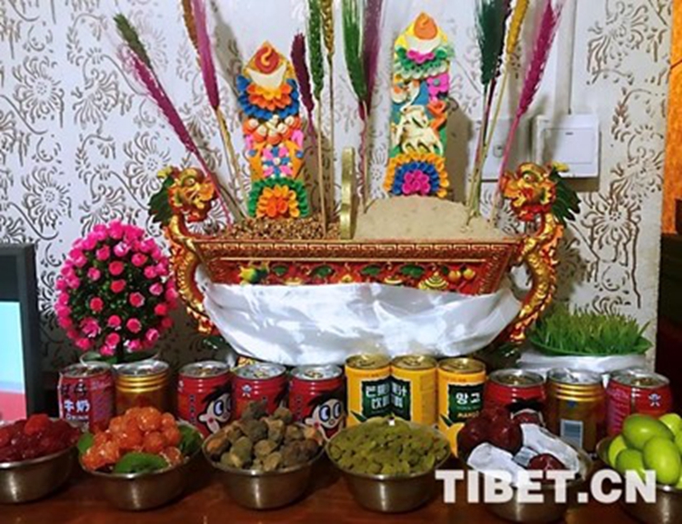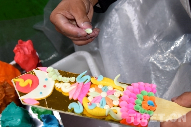 酥油花是藏民族雕塑藝術的一種特殊形式,它是以人物、花卉、樹木、飛禽、走獸等為主題的一種手工油塑藝術,具有悠久的歷史。藏歷新年期間,西藏群眾會在切瑪盒的左右兩邊分別裝滿糌粑和炒青稞,然后在上面插上象征五谷豐登的“羅薩美朵”(彩色青稞穗)和寓意吉祥的酥油花。(中國西藏網 記者/次旦拉姆)