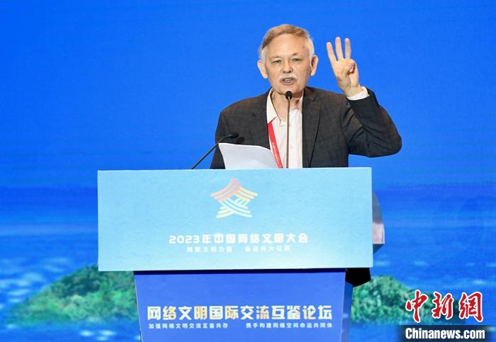 7月18日,2023年中國(guó)網(wǎng)絡(luò)文明大會(huì)網(wǎng)絡(luò)文明國(guó)際交流互鑒論壇在廈門舉辦。圖為廈門大學(xué)美籍教授潘維廉作主題演講。中新社記者 王東明 攝