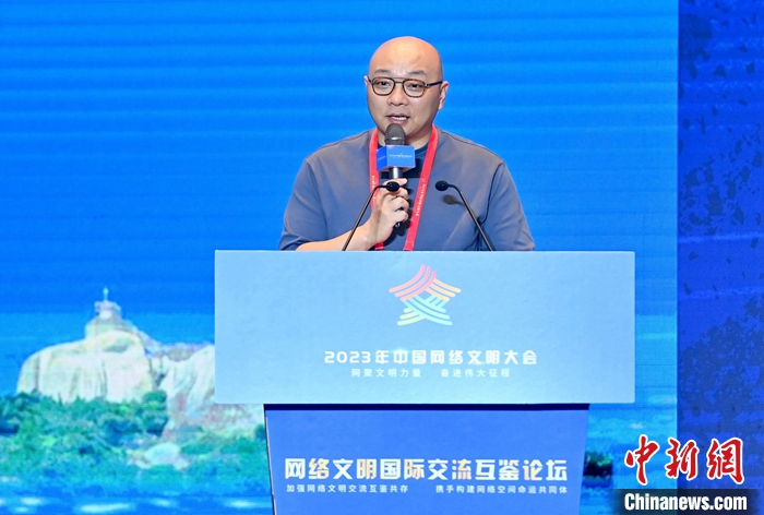 7月18日,2023年中國網(wǎng)絡(luò)文明大會(huì)網(wǎng)絡(luò)文明國際交流互鑒論壇在廈門舉辦。圖為完美世界首席執(zhí)行官蕭泓作主題演講。中新社記者 王東明 攝