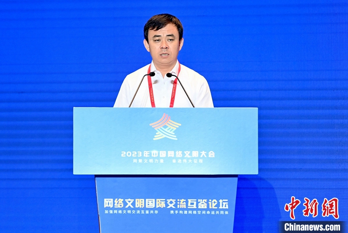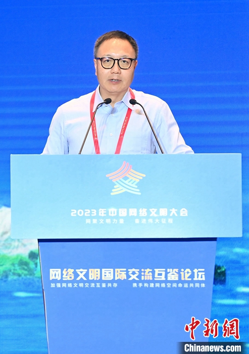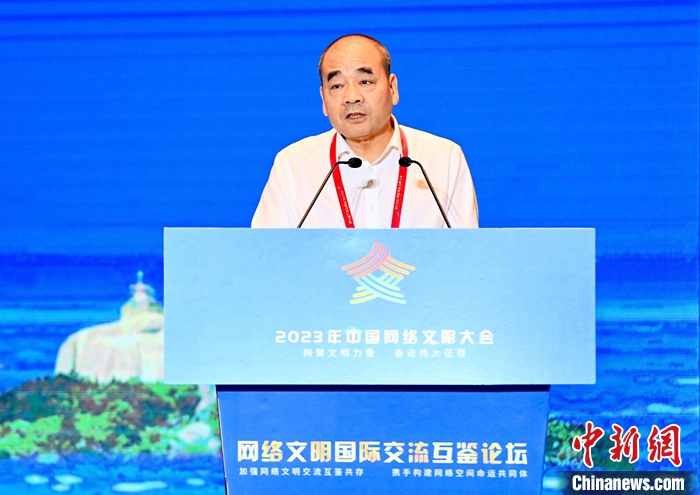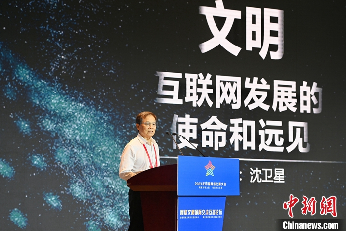 7月18日,2023年中國網(wǎng)絡(luò)文明大會(huì)網(wǎng)絡(luò)文明國際交流互鑒論壇在廈門舉辦。圖為光明日?qǐng)?bào)原副總編輯、浙大城市學(xué)院文明與傳播研究院研究員沈衛(wèi)星作主題演講。中新社記者 王東明 攝
