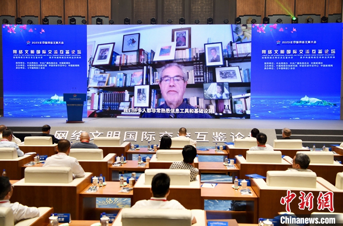 7月18日,2023年中國網(wǎng)絡(luò)文明大會(huì)網(wǎng)絡(luò)文明國際交流互鑒論壇在廈門舉辦。圖為比利時(shí)國際聯(lián)合倡議多邊合作組織榮譽(yù)主席米歇爾·杰諾韋塞作視頻演講。中新社記者 王東明 攝