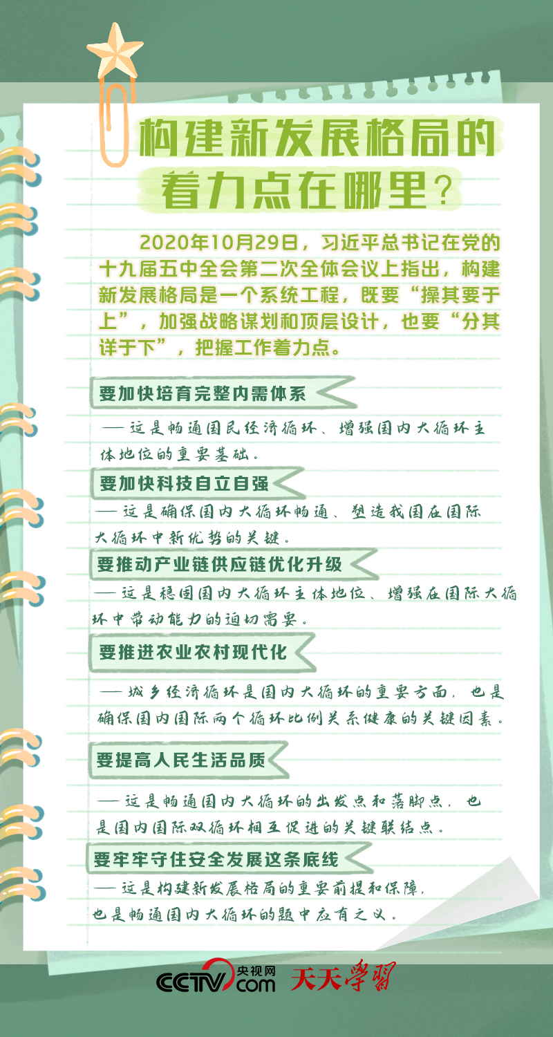 天天學(xué)習(xí)構(gòu)建以國內(nèi)大循環(huán)為主體、國內(nèi)國際雙循環(huán)相互促進(jìn)的新發(fā)展格局,是根據(jù)我國發(fā)展階段、環(huán)境、條件變化,特別是基于我國比較優(yōu)勢變化,審時度勢作出的重大決策。構(gòu)建新發(fā)展格局是事關(guān)全局的系統(tǒng)性、深層次變革,是立足當(dāng)前、著眼長遠(yuǎn)的戰(zhàn)略謀劃。