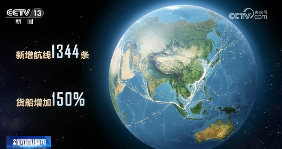 向大海,這是2013年時中國與共建“一帶一路”國家間的水運航線。十年間,共建“一帶一路”國家間的水運航線數(shù)量翻了一番,新增航線達到了1344條,穿梭其中的貨船增加150%?!敖z路海運”航線已通達全球43個國家的117個港口,織出了一張聯(lián)通世界的貿(mào)易流動網(wǎng)絡。