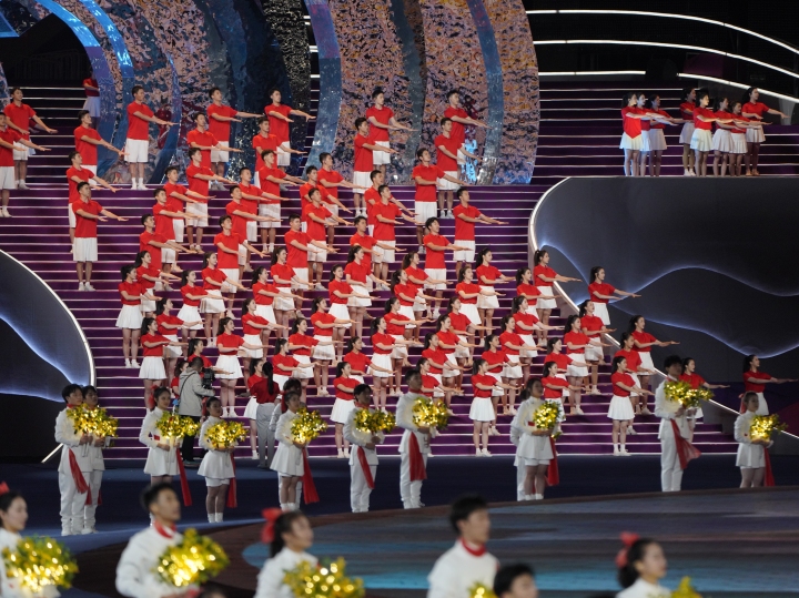 10月22日杭州亞殘運(yùn)會(huì)開幕式上,表演者用手語“唱”國歌。潮新聞?dòng)浾?楊朝波 攝