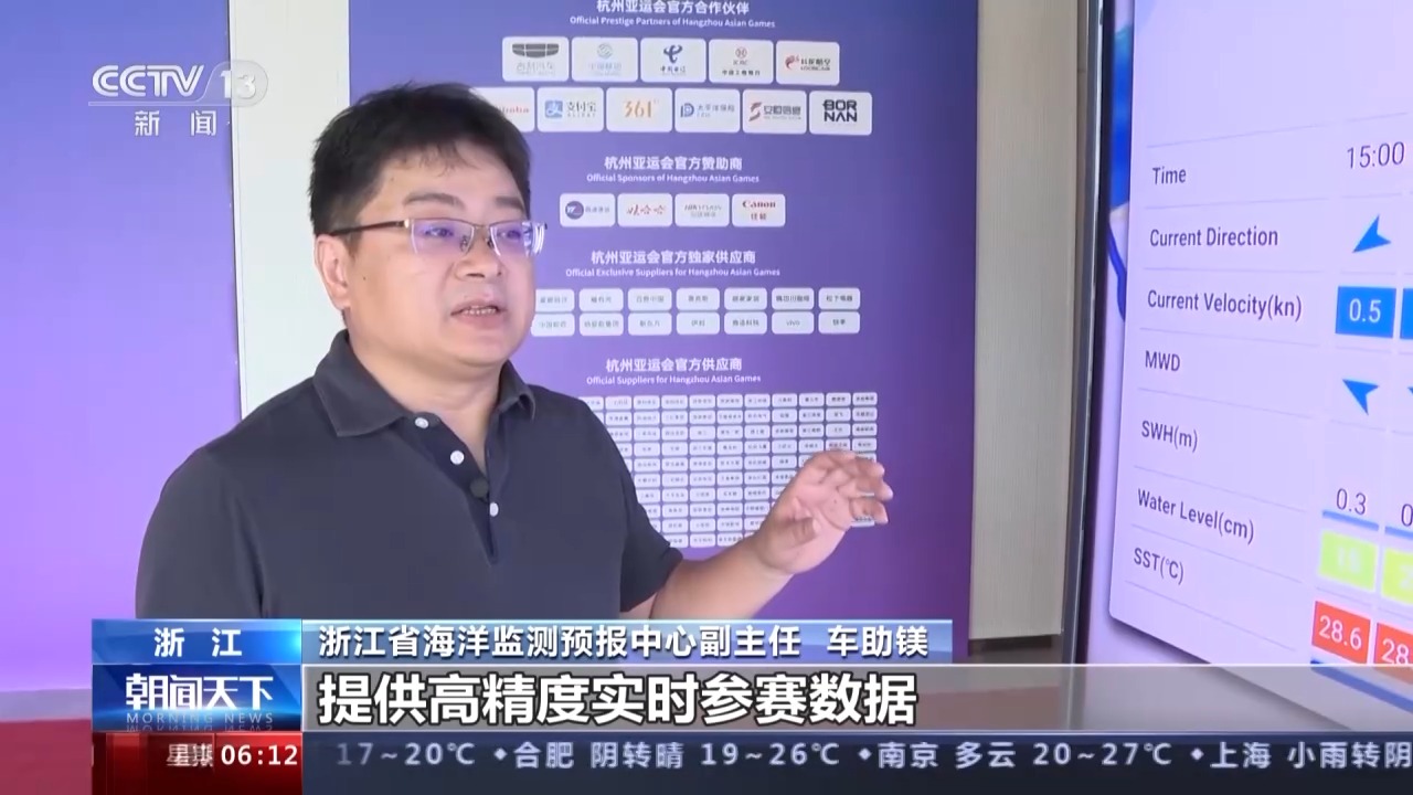 浙江省海洋監(jiān)測預(yù)報中心副主任 車助鎂:這是未來三小時的海洋預(yù)報信息,流向、流速、平均波向、涌高、水位、水溫,這些信息將為亞運(yùn)會帆船運(yùn)動員提供高精度實時的參賽數(shù)據(jù)。