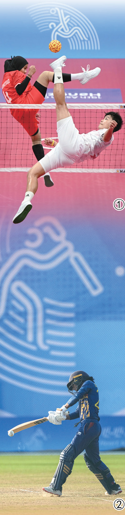 圖①:9月24日,藤球女子單組團體預選賽,泰國體育代表團選手曼立卡·汶托(前)對陣印度尼西亞體育代表團選手。