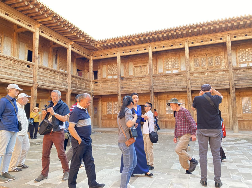 中午,調(diào)研組在黃南藏族自治州尖扎縣噶達(dá)莊園品嘗了藏族美食??勺匪莅倌隁v史的噶達(dá)莊園是當(dāng)?shù)毓爬藗}活佛的故居后花園,園內(nèi)樹木茂密、鳥語花香,海外學(xué)者們紛紛表示,在這個(gè)充滿歷史文化氛圍的莊園用餐是一次難忘的體驗(yàn)。下午,調(diào)研組一行參觀了尖扎縣昂拉鄉(xiāng)昂拉千戶府和昂拉賽康寺。昂拉千戶府始建于清代,1941年重建,1949年竣工。莊園占地面積約4600平方米,是青海省保留比較完整的藏式莊園。該莊院建筑風(fēng)格獨(dú)特,前院用木質(zhì)結(jié)構(gòu)建造,后院用土木結(jié)構(gòu)建造,其整體建筑風(fēng)格采用了漢式山水元素。