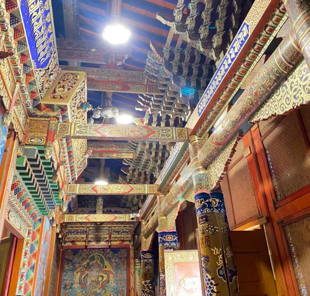 下午,調(diào)研組一行參觀了吾屯下寺。吾屯下寺,藏語(yǔ)為“ ”,意為“吾屯具善圓滿洲”。吾屯下寺的主尊千手千眼觀音是鎦金泥塑,高達(dá)10多米,細(xì)節(jié)極其精致,由全寺泥塑高手合力塑成的,代表著當(dāng)代吾屯下寺最高的泥塑水平,也是漢、藏、土等民族文化交融的產(chǎn)物。
