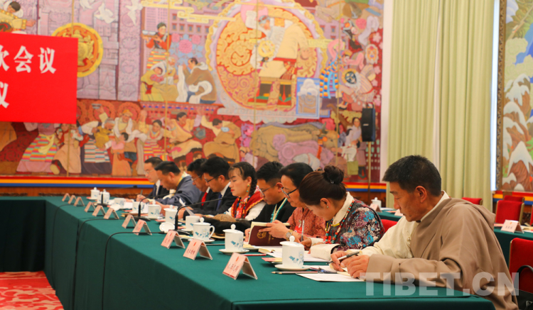 圖為扎西江村(右四)參加十四屆全國人大二次會議西藏代表團開放團組會議 攝影:桑吉