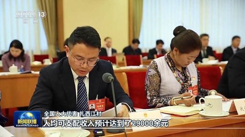 圖為扎西江村發(fā)言圖片來源:新聞聯(lián)播
