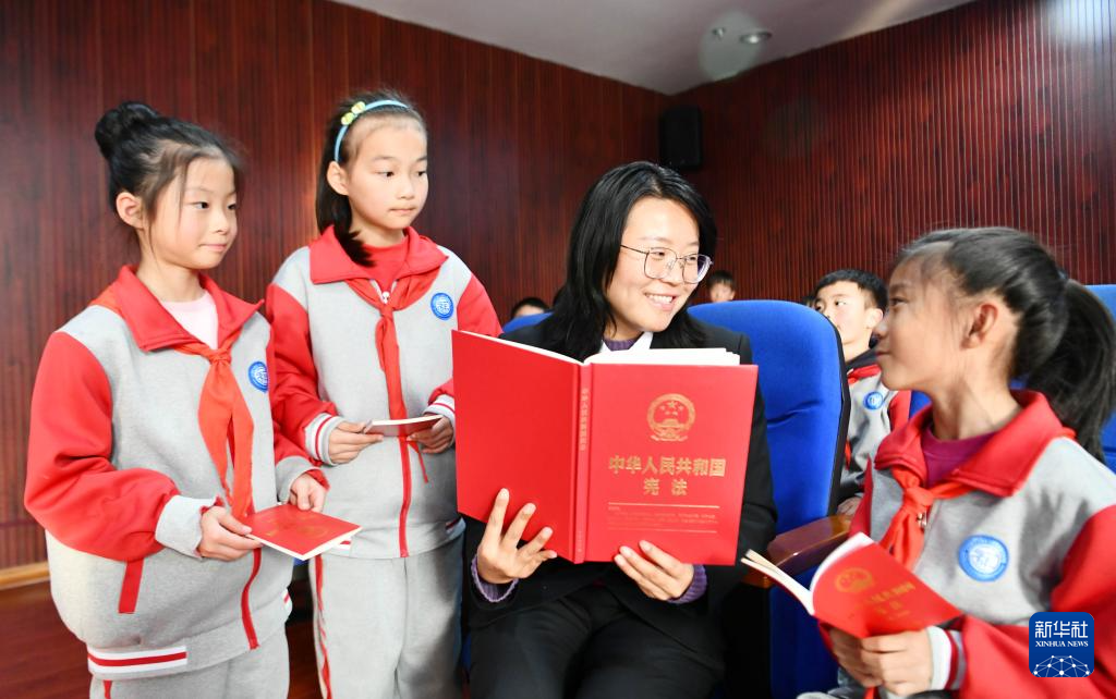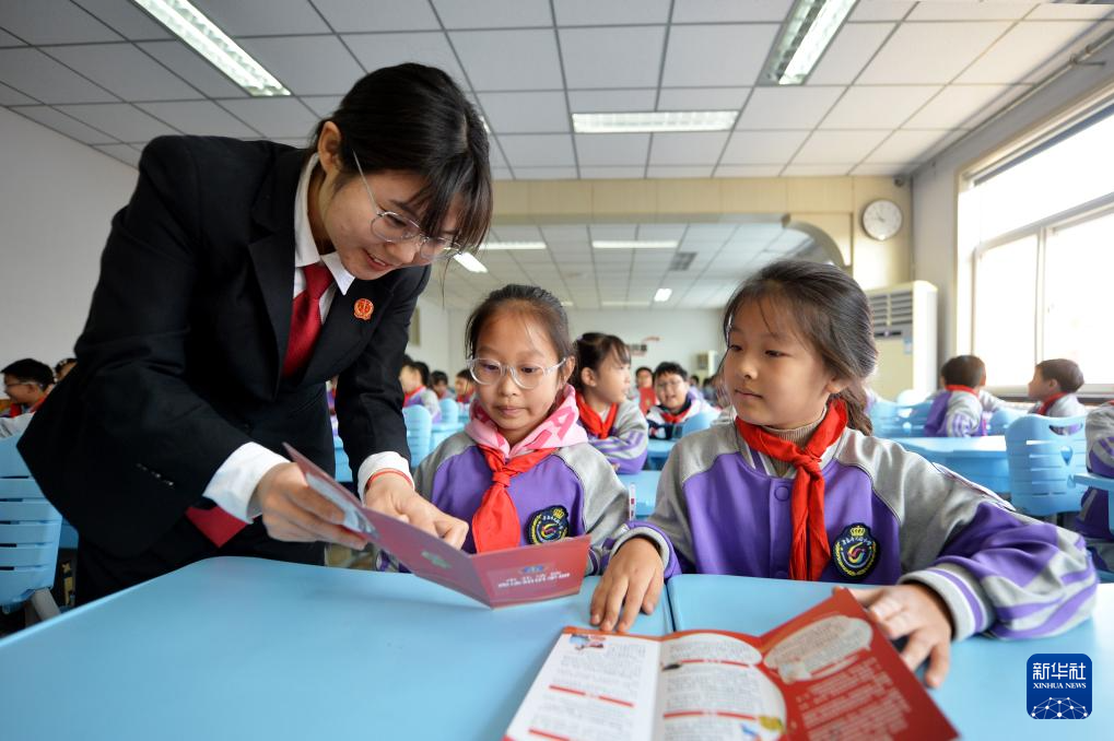 12月3日,在山東青島壽光路小學(xué)開展的憲法知識進(jìn)校園活動上,法官在指導(dǎo)學(xué)生學(xué)習(xí)憲法知識。