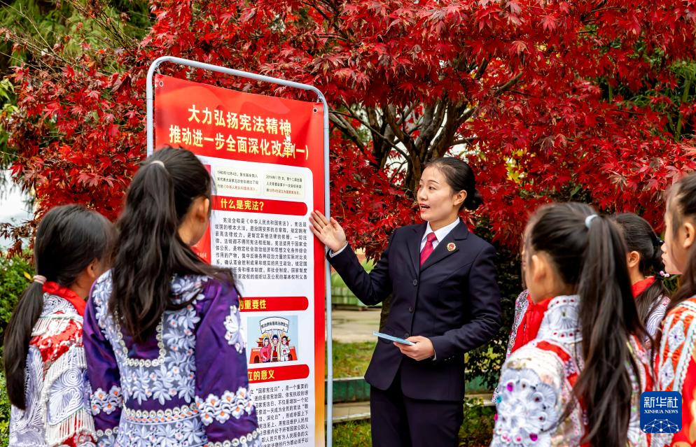 12月3日,貴州省黔西市人民檢察院的檢察干警在新仁苗族鄉(xiāng)化竹小學(xué)為學(xué)生普及憲法知識。