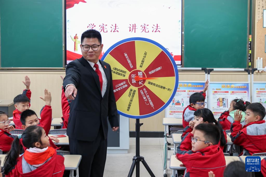 12月3日,在浙江省湖州市德清縣雷甸鎮(zhèn)中心小學(xué),德清縣人民法院雷甸人民法庭工作人員通過知識大轉(zhuǎn)盤為學(xué)生普及憲法知識。