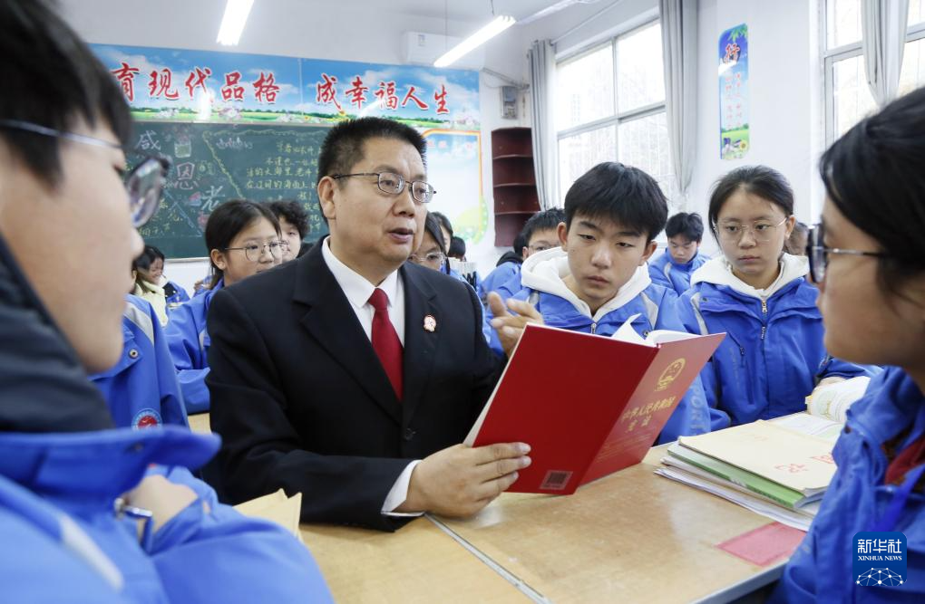 12月3日,河南省洛陽市汝陽縣人民法院法官為縣直屬初級中學(xué)學(xué)生講解新中國憲法發(fā)展歷程。