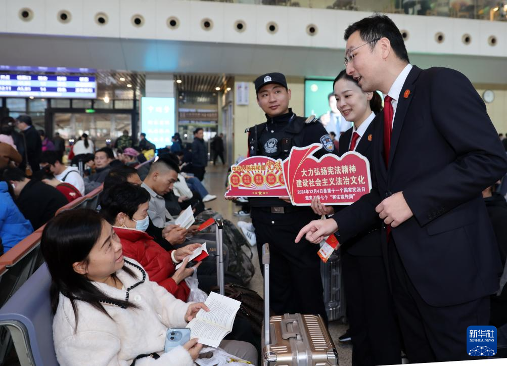 12月3日,武漢鐵路運(yùn)輸中級法院法官在武漢火車站為旅客宣傳憲法知識。