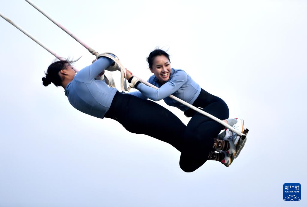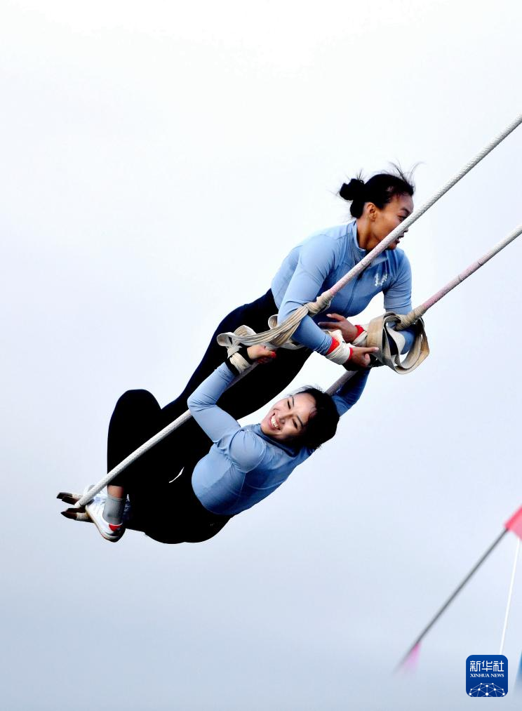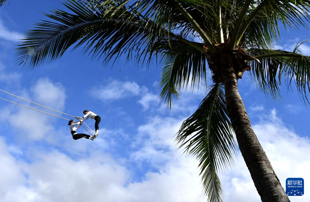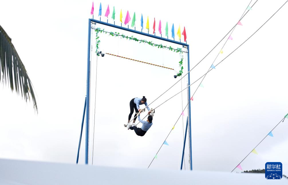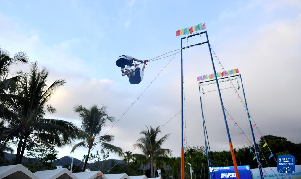 當(dāng)日,第十二屆全國(guó)少數(shù)民族傳統(tǒng)體育運(yùn)動(dòng)會(huì)秋千55公斤以上雙人高度決賽在海南三亞舉行。