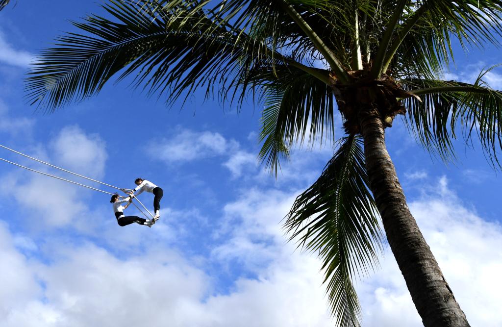 11月24日,上海隊(duì)組合劉雨諾/張涵瑾(左)在比賽中。當(dāng)日,第十二屆全國少數(shù)民族傳統(tǒng)體育運(yùn)動會秋千55公斤以上雙人高度決賽在海南三亞舉行。新華社記者 王曉 攝