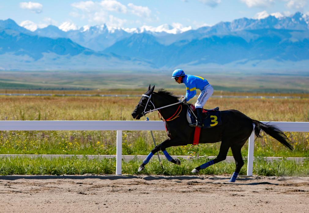 7月13日,湖北代表隊(duì)選手覃勇和賽馬“雁春金冠”在比賽中。當(dāng)日,第十二屆全國少數(shù)民族傳統(tǒng)體育運(yùn)動會馬上項(xiàng)目民族賽馬8000米比賽在新疆昭蘇進(jìn)行。新華社記者 陳朔 攝