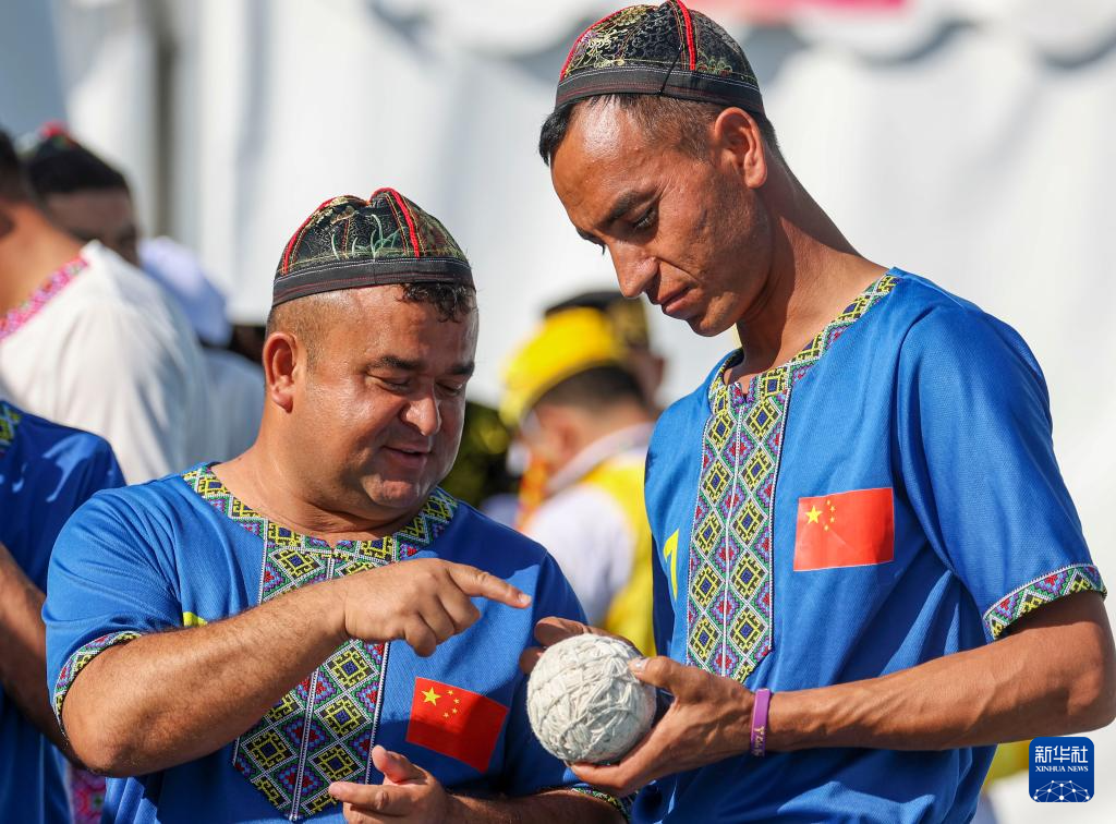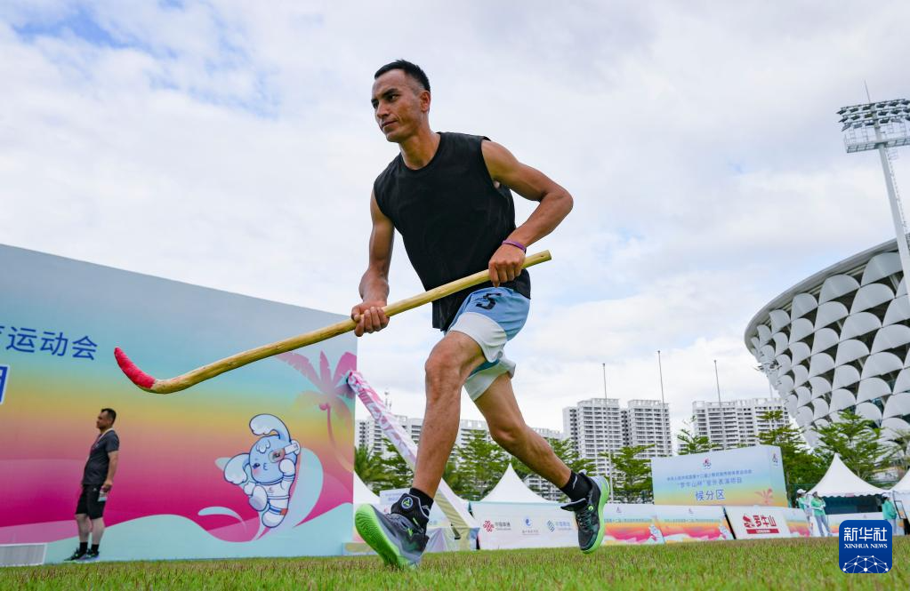 這是11月24日,在三亞市體育中心舉行的第十二屆全國(guó)少數(shù)民族傳統(tǒng)體育運(yùn)動(dòng)會(huì)室外表演項(xiàng)目中,新疆隊(duì)球員阿卜杜拉艾孜則·阿卜杜海娃爾(前右)在麥熱球表演中。