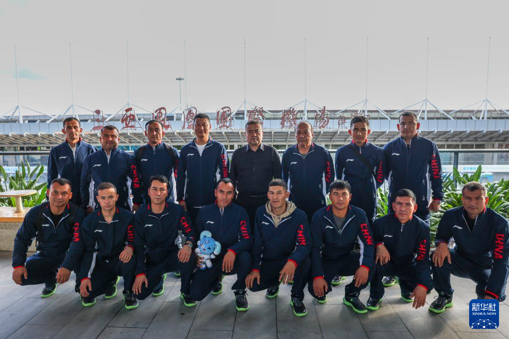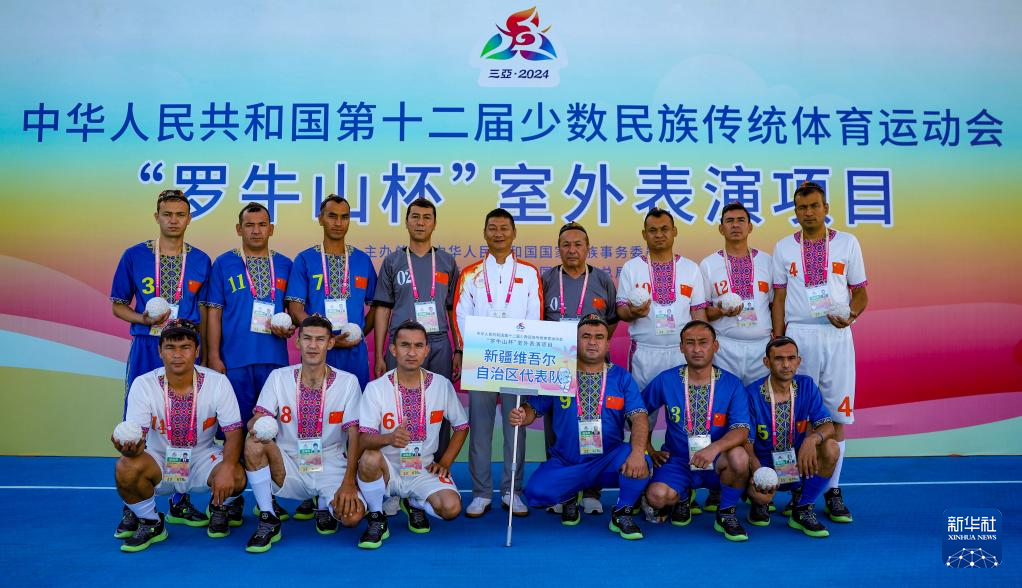 這是11月24日,在三亞市體育中心,新疆麥熱球隊(duì)成員在第十二屆全國(guó)少數(shù)民族傳統(tǒng)體育運(yùn)動(dòng)會(huì)室外表演項(xiàng)目開(kāi)始前合影。