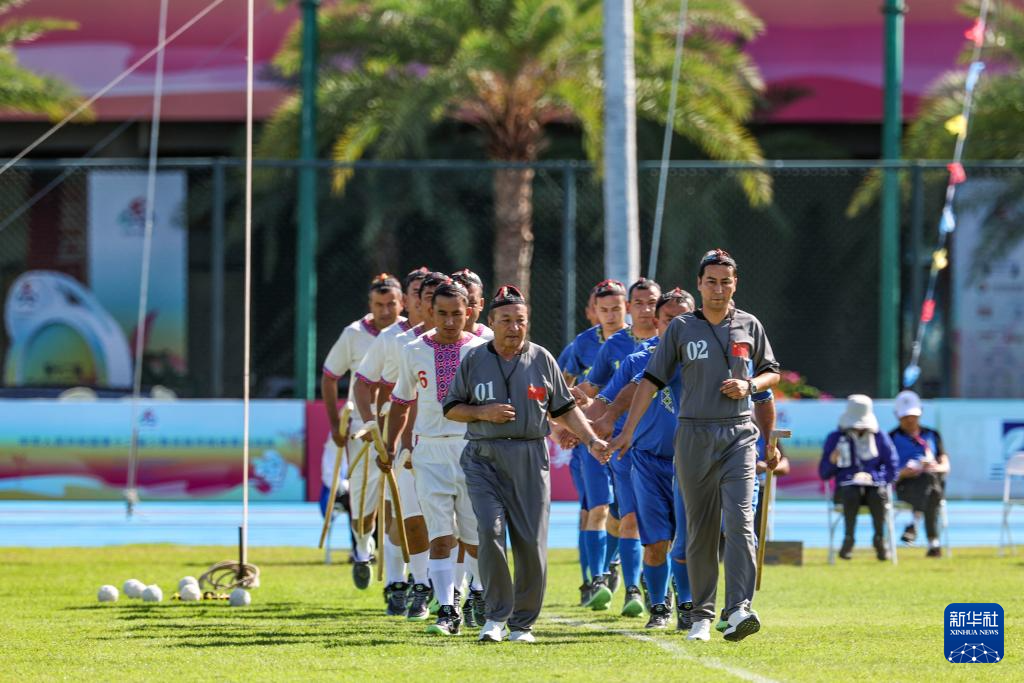 這是11月24日,在三亞市體育中心舉行的第十二屆全國(guó)少數(shù)民族傳統(tǒng)體育運(yùn)動(dòng)會(huì)室外表演項(xiàng)目中,新疆麥熱球隊(duì)隊(duì)員入場(chǎng)。