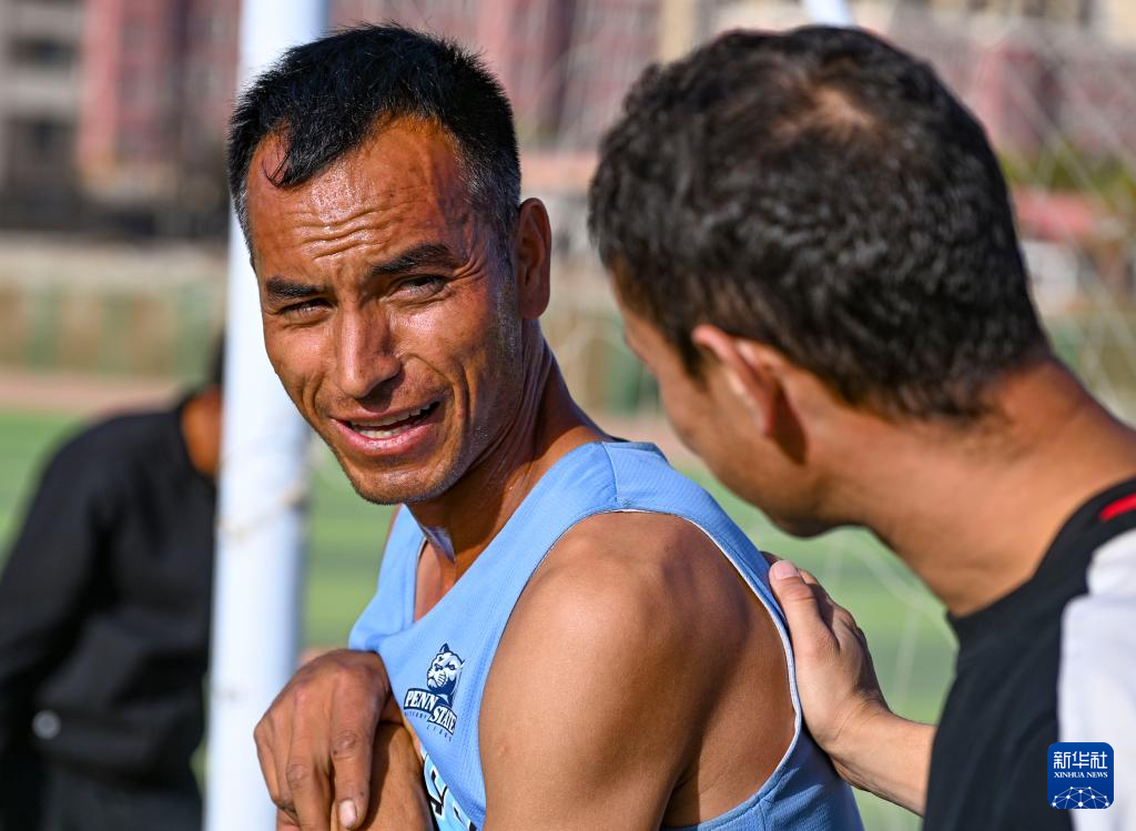 這是11月8日,在新疆于田縣體育場(chǎng),阿卜杜拉艾孜則·阿卜杜海娃爾(左)和隊(duì)長(zhǎng)吾買(mǎi)爾江·買(mǎi)買(mǎi)提明在訓(xùn)練中。