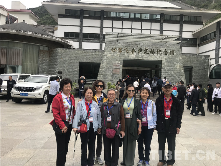 十八軍老戰(zhàn)士和及其后代在紅軍飛奪瀘定橋紀念館前合影。 攝影:龍真多吉