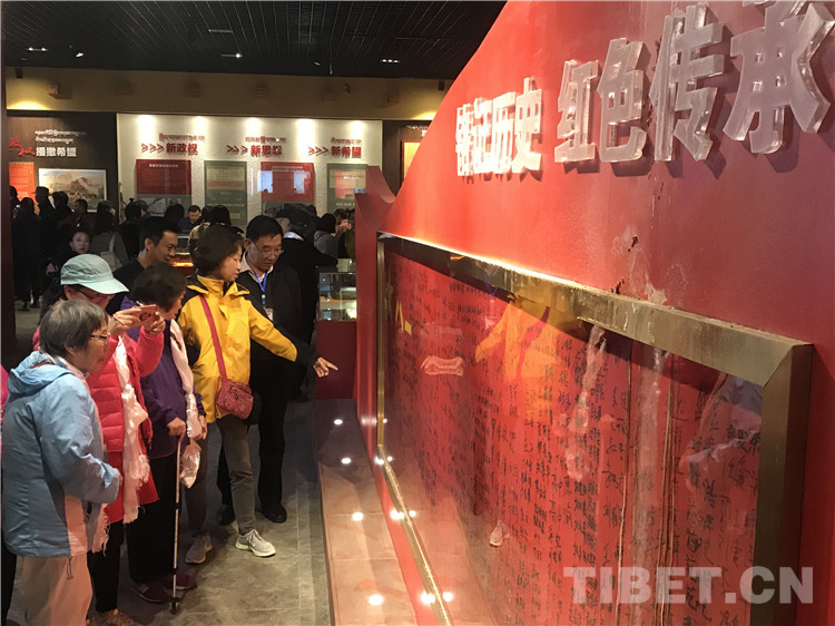 圖為十八軍老戰(zhàn)士及十八軍后代一行在甘孜縣朱德總司令和五世格達活佛紀念館內參觀。攝影:龍真多吉