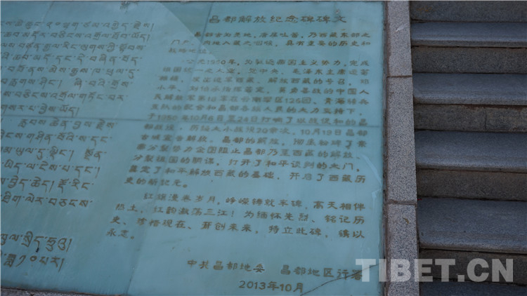 行至紀(jì)念碑背面,可見一處記錄著昌都解放歷史的漢藏雙語(yǔ)碑文,土呷主席講道:“當(dāng)時(shí)住建局委托我寫碑文,我在之前碑文的基礎(chǔ)上作了補(bǔ)充,形成了現(xiàn)在的碑文。”