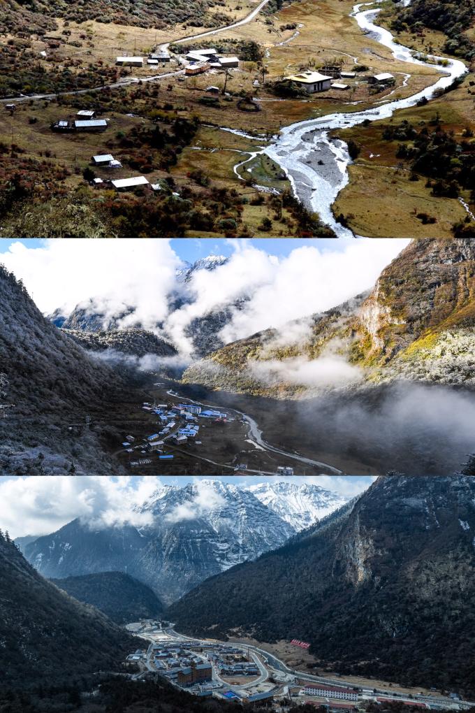 拼版照片:上圖是2003年10月26日拍攝的玉麥鄉(xiāng)(新華社記者 索朗羅布 攝);中圖是2017年10月31日拍攝的玉麥鄉(xiāng)(新華社記者 普布扎西 攝);下圖是2026年2月5日拍攝的玉麥鄉(xiāng)(無人機(jī)照片,新華社記者 丁增尼達(dá) 攝)。