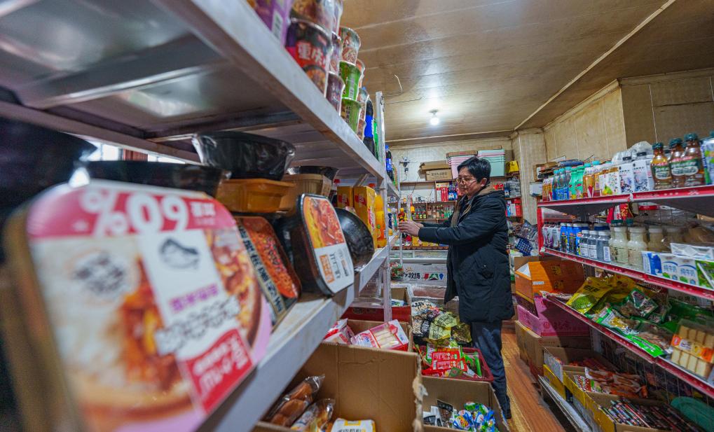 2月5日,玉麥鄉(xiāng)一家超市的老板在整理貨架。新華社記者 丁增尼達(dá) 攝