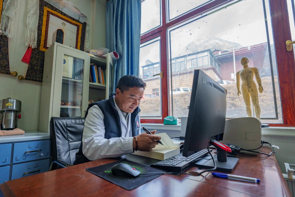 2月5日,玉麥鄉(xiāng)衛(wèi)生院副院長次旦米久在辦公室研讀藏醫(yī)書籍。新華社記者 丁增尼達(dá) 攝