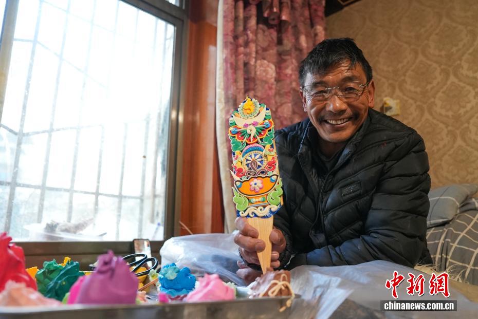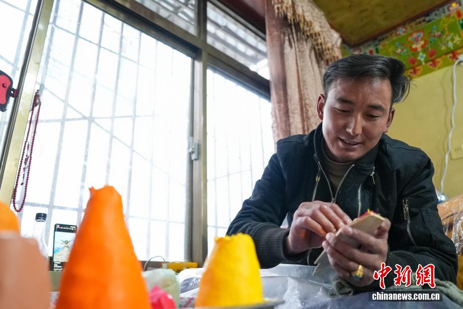 2月4日,隨著藏歷新年臨近,拉薩街頭年味漸濃,年貨市場上的“孜扎”迎來熱銷。酥油花藏語稱“孜扎”,是藏歷新年吉祥物切瑪盒的重要組件,也是藏族民眾家中必備的年貨。酥油花以酥油為主要原料,由匠人純手工捏制而成,造型涵蓋佛像、人物、花卉樹木、飛禽走獸等,常見圖案包含吉祥八寶、和諧四瑞、長壽圖等,承載著藏族民眾對新年平安吉祥、萬事順?biāo)斓拿篮闷碓浮D為手工藝人在制作酥油花。貢確 攝