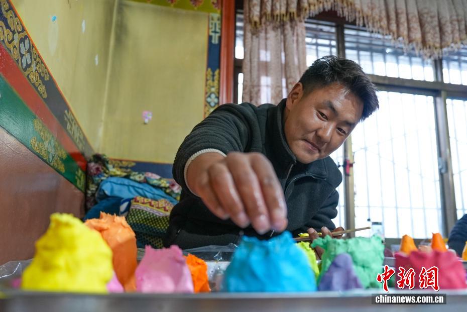 2月4日,隨著藏歷新年臨近,拉薩街頭年味漸濃,年貨市場上的“孜扎”迎來熱銷。酥油花藏語稱“孜扎”,是藏歷新年吉祥物切瑪盒的重要組件,也是藏族民眾家中必備的年貨。酥油花以酥油為主要原料,由匠人純手工捏制而成,造型涵蓋佛像、人物、花卉樹木、飛禽走獸等,常見圖案包含吉祥八寶、和諧四瑞、長壽圖等,承載著藏族民眾對新年平安吉祥、萬事順?biāo)斓拿篮闷碓?。圖為手工藝人在制作酥油花。貢確 攝