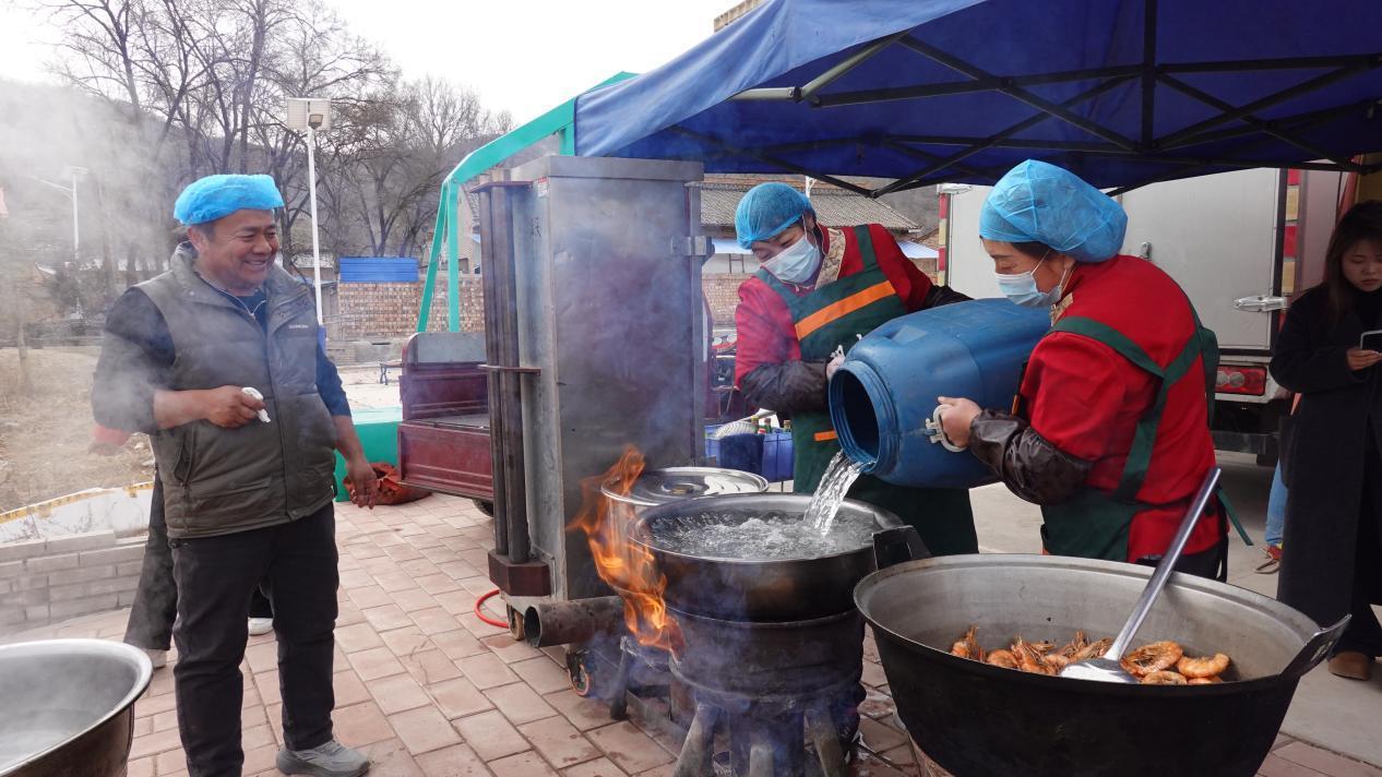 大家一起動(dòng)手,不到半小時(shí),一個(gè)大約一百平方米的移動(dòng)帳篷宴會(huì)廳平地而起,配套的桌椅、桌布、取暖設(shè)備和照明電燈等一樣不少。鍋灶、煤氣爐、蒸箱一字排開,就在帳篷門口,真正“明廚亮灶”。備好了大件,大家開始洗青菜、擇菜,這些當(dāng)天現(xiàn)弄才新鮮。