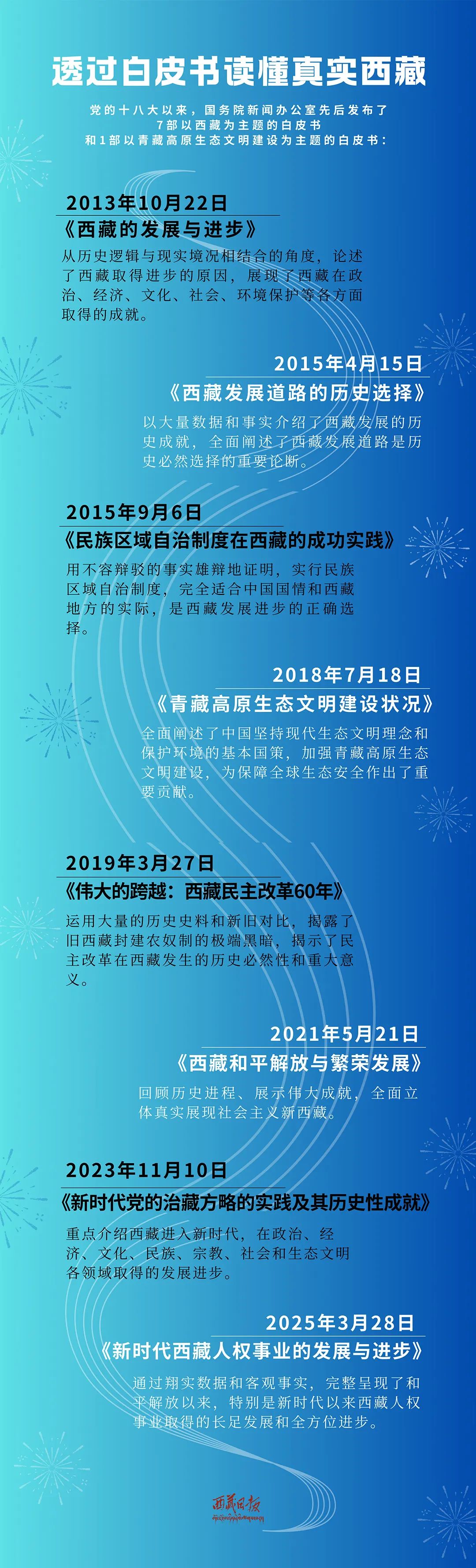 3月28日,國(guó)務(wù)院新聞辦公室發(fā)布《新時(shí)代西藏人權(quán)事業(yè)的發(fā)展與進(jìn)步》白皮書(shū)。這也是黨的十八大以來(lái),國(guó)務(wù)院新聞辦公室發(fā)布的以西藏為主題的第七部白皮書(shū)。這些白皮書(shū)涉及西藏經(jīng)濟(jì)社會(huì)發(fā)展的各方面,真實(shí)地展現(xiàn)了西藏步入發(fā)展最好、變化最大、群眾得實(shí)惠最多的新時(shí)代,各項(xiàng)事業(yè)取得的全方位進(jìn)步、歷史性成就。