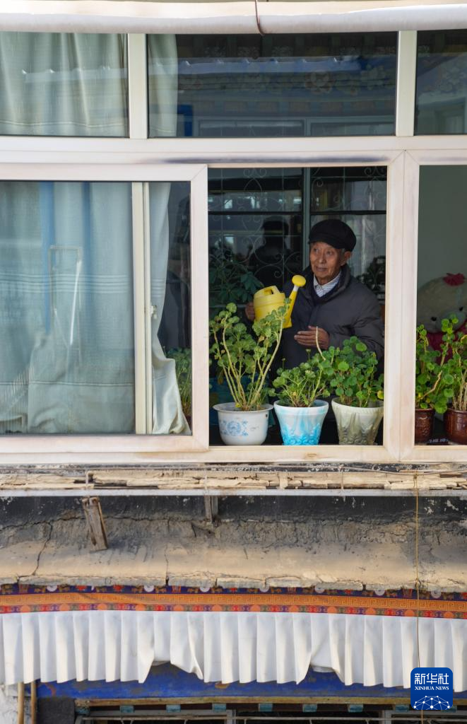 洛桑貢布在自家二樓陽臺(tái)澆花(3月27日攝)。