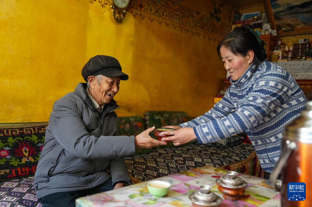 大兒媳央金給洛桑貢布(左)敬茶(3月27日攝)。