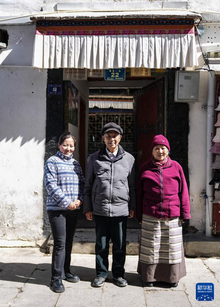 洛桑貢布(中)和大兒媳央金(左)、老伴次仁白姆在家門口前合影(3月27日攝)。