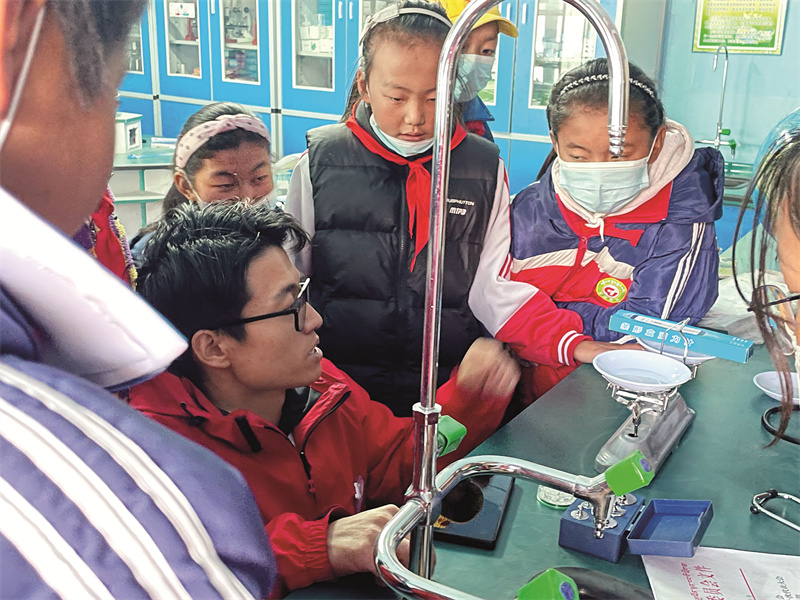 后來(lái)經(jīng)過(guò)層層選拔,王育帥成為了第十四批支教團(tuán)隊(duì)中的一員,在山南市瓊結(jié)縣完全小學(xué)負(fù)責(zé)一、二年級(jí)的科學(xué)課教學(xué)任務(wù)。在教學(xué)實(shí)踐中,他發(fā)現(xiàn)孩子們都有著無(wú)窮的好奇心,于是常常在課堂上啟發(fā)學(xué)生們領(lǐng)悟?qū)W習(xí)的意義,鼓勵(lì)他們立下階段性或者更長(zhǎng)遠(yuǎn)的目標(biāo)?!拔乙步?jīng)常在課堂上向?qū)W生們展示一些有趣的科學(xué)現(xiàn)象,讓他們根據(jù)現(xiàn)象探索背后的原理,很多學(xué)生還會(huì)利用周末時(shí)間主動(dòng)找我探討科學(xué)問(wèn)題?!?/p>