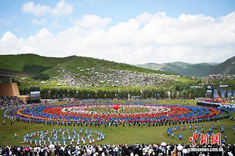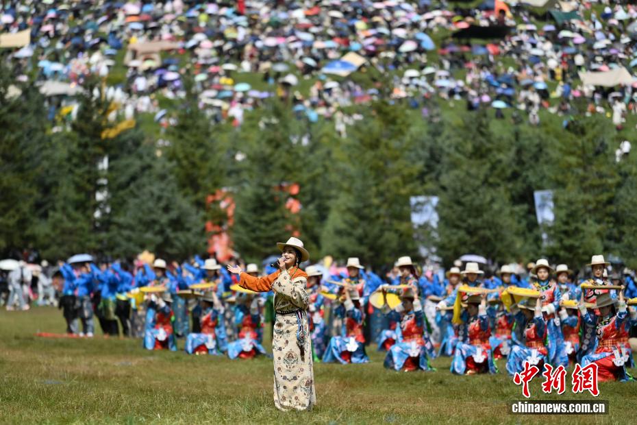圖為開(kāi)幕式現(xiàn)場(chǎng)“萬(wàn)人鍋莊”表演。中新社記者 九美旦增 攝